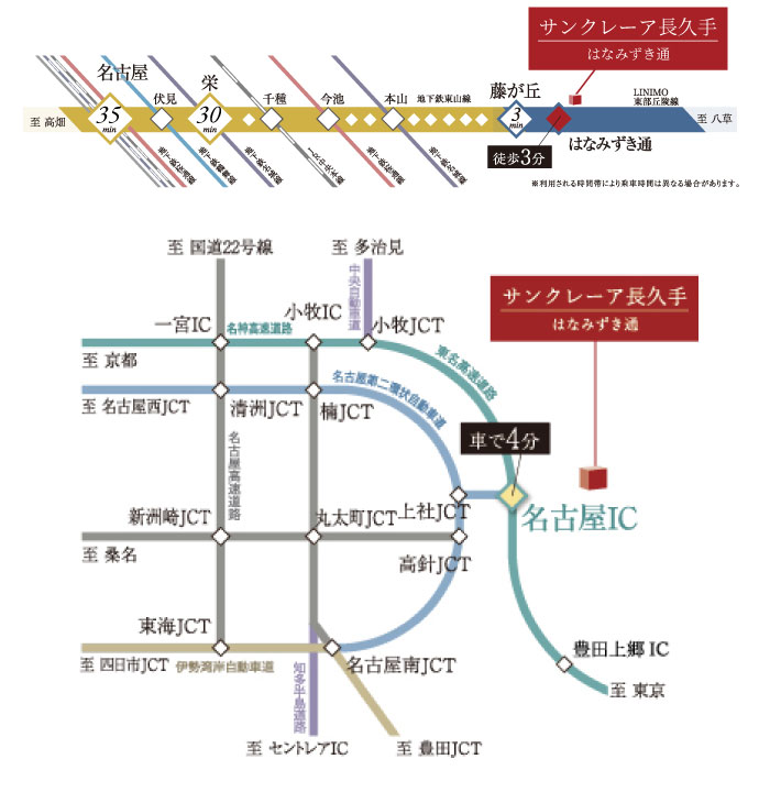 「はなみずき通」駅は「藤が丘」駅からわずか1駅の“名古屋に一番近いリニモ駅”。地下鉄東山線に接続すれば「名古屋・伏見・栄」方面へスピーディに通勤できるほか、「名古屋IC」も車で約4分の近さにあるため、三河方面へのカーアクセスも軽快に行えます。